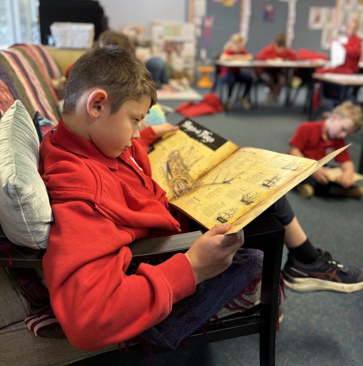 Boy seated on a lounge reading a book.